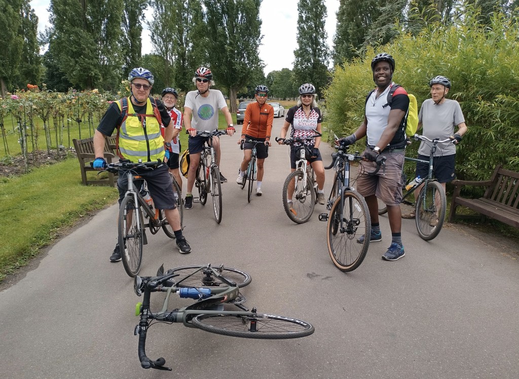 Sunday 22nd August. A largely grey day saw 19 Cyclists split into 2 groups, leave via Surbiton, Long Ditton, Hinchley Wood, Esher, Claremont, Fairmile, Cobham, Downside, Bookham Common including ‘the Isle of Wight’ ?, Fetcham, (Photo group 1), Leatherhead to Ashtead for lunch at ‘the Woodman’, Ashtead Park, Epsom, East Ewell, Nonsuch Park, Cheam Park, North Cheam, Lower Morden to the ‘Blue Diamond’ Garden Centre, -including a long tour of the building to the Cafe-, for Tea & Bread Pudding, Morden Cemetery, (Photo group 2), Motspur park, New Malden, Berrylands to finish back in Kingston. Total 32 Miles, 1 new face, Special thanks to Carl (with a little help from Bai), for Group leading, thanks to Mike & Amy for back marking, thanks to John D for the BP.