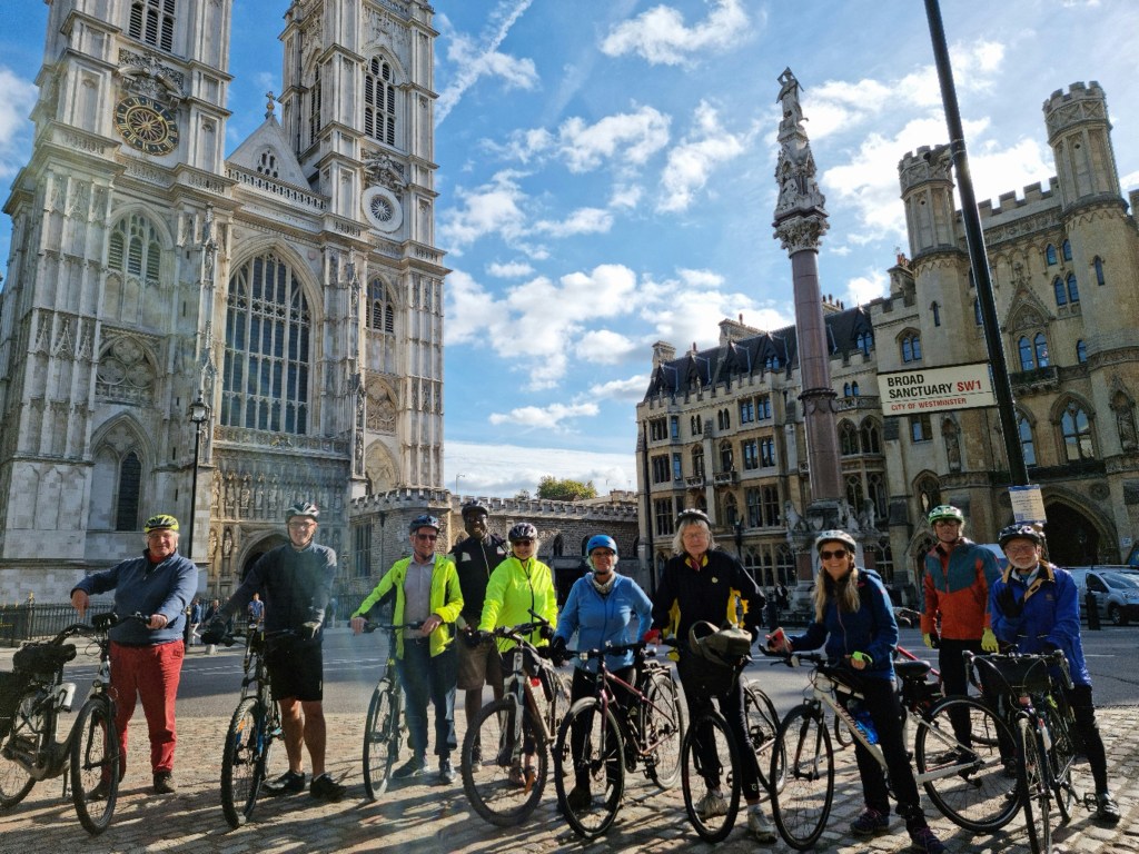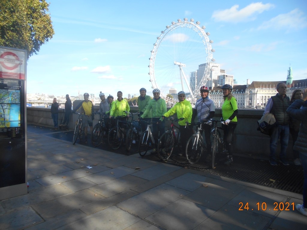 Sunday 24th October. With 1 late cancellation, & 1 unannounced guest, a rather Cloudy Morning, & a Sunny Afternoon, saw 20 Cyclists split into 2 groups, leave New Malden, via the Beeline (C31), Raynes park, South Wimbledon, a stretch of the Wandle trail- with 1 more joining group 1-, Wandsworth Common, Clapham Common, -with 1 member of group 2 suffering a Saddle Malfunction, manage to find a Bike shop, get a new Saddler fitted & rejoin the ride before the end of lunch, quite impressive-, Vauxhall (Q5), Vauxhall Bridge CS5), to Pimlico for lunch at the ‘White Swan’ (McMullens), Westminster (Photo group 2), Victoria Embankment (CS3), to Southwark Bridge CS7), Borough, Walworth (C17), Burgess Park, Loughborough, Brockwell Park, Tulse Hill, Streatham, To Tooting Bec Common, for Tea & Bread pudding, Tooting, Mitcham, Morden Hall Park, Morden, Morden Park, Lower Morden, Motspur park, to finish back at New Malden. Special thanks to Bai for leading group 2, thanks to Steve D & Mike F for back marking each group, thanks to John D for the BP. It was good to see Tom again after the incident earlier in the Summer.