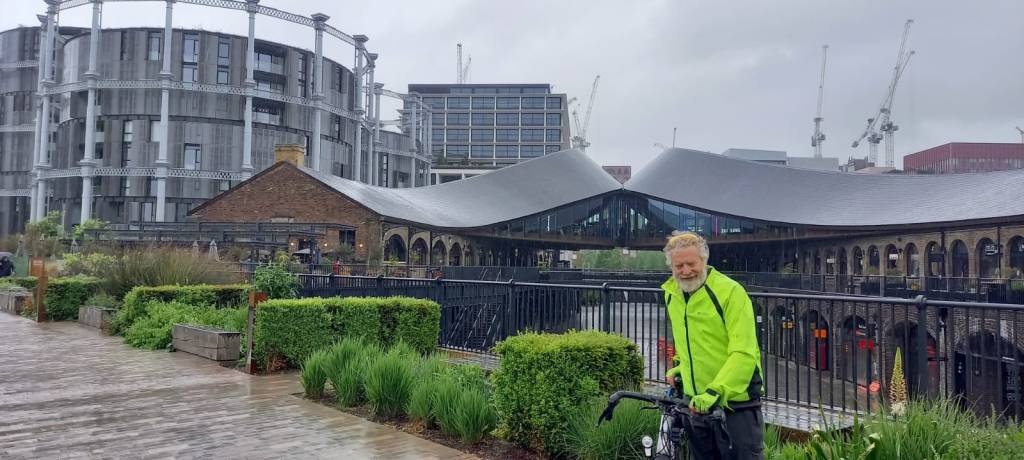 Wednesday 11th May, a strong blustery wind to start, before light Drizzle, turned to steady Rain. After 1 Cancellation & 1 no show, 11 Cyclists left New Malden on the Beeline, Raynes park, Wimbledon Chase, Wimbledon, Wandle path, Earlsfield, Wandsworth Common, Clapham Common, Stockwell, Oval, the first of several missed turns (had the drizzle woked it’s way into the sat-nav?), Waterloo, another missed turn, Southwark Bridge instead of Blackfriars, Cycleway 3, to rejoin the planned route in Blackfriars, Cycleway 6, Farringdon, -yet another navigation malfunction, Angel, eventually back on track to the Regents Canal Towpath-, to ‘Granery Square’, -with Steady rain, no-one fancied the planned Picnic, but luckily, there was a very handy Canopy outside Waitrose, as they also had a Cafe for those who fancied something warm-, a quick stop to look at the ‘Kissing roof’s’ (Photo), an even briefer stop to look at the Gasholders, as the Rain seemed to be worsening, Old St Pancras Churchyard, brief word about ‘the Hardy Tree’, Euston, Regents Park, – with a majority voting for a Train option-, Marylebone, Hyde Park, to find queues of people trying to get to a Buckingham Palace Garden Party, had closed off option 1, so Victoria instead of Waterloo, 4 brave souls continued via Chelsea Bridge, Battersea Park, Wandsworth, Wandsworth Park, Putney, Barnes, Roehampton, Richmond Park to finish at Kingston gate. Total 35 Miles, Special thanks to John E for back marking. Map:- www.plotaroute.com/route/1451753