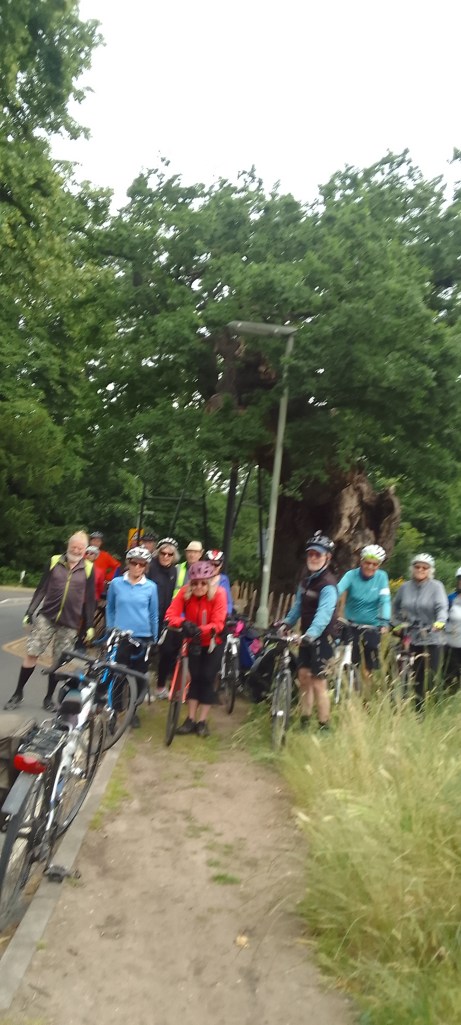 Long Ditton- joined by 1 more (15), Giggshill Green, Weston Green, Esher- with work in progress on the Weir gate, a short dismount to walk past the obstruction, Walton, Weybridge, Addlestone, to visit the ‘Crouch Oak’ (Photo), a splendid ancient tree, circa 800 years old, reputedly Queen Elizabeth I enjoyed a picnic under the tree, now supported by some Ironwork, closing 1 of the traffic lanes, a novel ‘Low traffic neighbourhood’ me thinks, Bretlands, to Lyne for lunch at the ‘Royal Marine’, then Thorpe Green, Stroude, Egham, Staines Bridge, Staines, Ashford, Sunbury, Feltham, Hanworth, Hampton, Bushy Park, for refreshments at the Pheasantry- with new much more Cyclist friendly gates-, Hampton Wick, Kingston Bridge, to finish back in Kingston. Total 31 Miles, thanks to Chris F for back marking, & others for marking corners. Map:- www.plotaroute.com/route/1049116