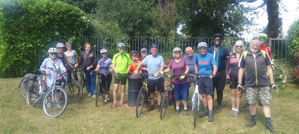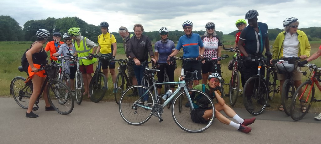 Sunday 23rd June. Part 1. A bright Sunny Morning with 1 late booking, 1 late cancellation & 1 unannounced guest, 18 Cyclists- no wait, 1 person tried following a different group, Kingston Wheelers? Despite the valiant efforts of the back marker, he couldn’t be caught-, so 17 left via Kingston Bridge, Bushy Park, Hampton- pausing to visit the Memorial to General Roy, ‘Grandfather of the Ordenance Survey’-, (Photo), Hanworth, Hanworth Park, Leitrim Park, River Crane path, Kneller Gdns to Twickenham for lunch at the Prince Blucher (Fullers), also joined by the ‘lost Sheep’ (18), Strawberry hill, Teddington, Hampton Wick, Kingston Bridge to finish back in Kingston. Sub-total 14 Miles, special thanks to Andrea for back marking & attempting to recover the lost sheep. Map:- www.plotaroute.com/route/528789