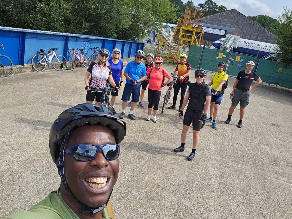 A slightly cloudy Morning, with more Sun after lunch, after 1 late booking, 20 Cyclists, split into 2 groups, leave via Portsmouth Rd, Giggshill Green- adding 1 more for group 2-, Weston Green, Esher- 1 more for group 1-, Walton, Weybridge, Brooklands Park (Photo’s), Byfleet village, Wisley, to Pyrford Lock for lunch at the Anchor (Hall & Woodhouse)- joined by 1 more for group 2 (23)-, Wanham gates, Ripley Green, Ockham, Hatchford, Cobham, Fairmile, to Claremont Lake Cafe (National Trust), for refreshments, Esher, Hinchley wood, Long Ditton, Surbiton to finish back in Kingston. Total 29 Miles, 3 new faces, special thanks to Bai for leading group 2, thanks to Steve D & Andrea E for back marking each group.