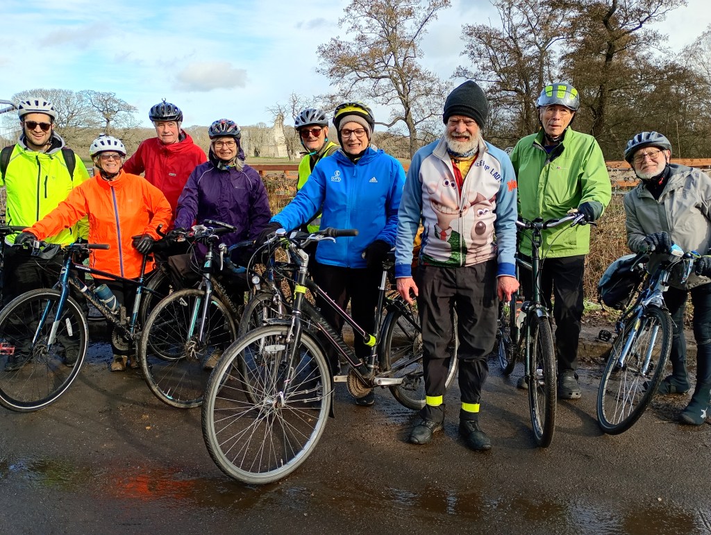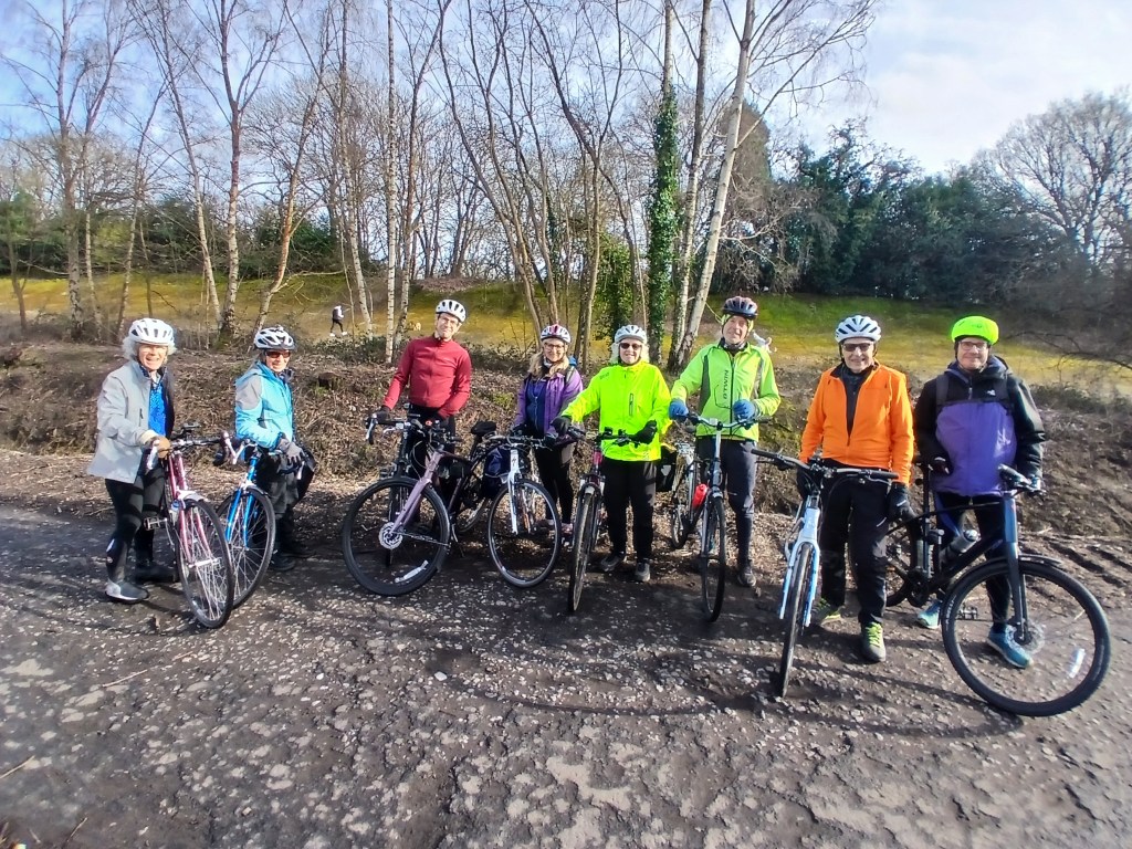 With Grey overcast skies, & just a few drips & drops of rain, after 2 cancellations, 19 Cyclists split into 2 groups, then via Surbiton, Long Ditton, Hinchley wood, Esher, Fairmile- with group 1 having a visit from the ‘P fairy, thus group 2 took the lead-, Cobham, Hatchford, Ockham, to Ripley for lunch at the Jovial Sailor (Barons pubs), now with Blue skies & some Sun, still with group 2 in front, via Send Marsh, Newark- taking advantage of the ‘closed Road’-, (Photo, group 1), Pyrford, a brief visit to the Wey navigation, Byfleet village, Brooklands Park (Photo group 2), -somehow Group 1 managed to grab the lead back 🙄-, Weybridge, Walton, Molesey, to Molesey Cricket club for Tea & refreshments at Miss Polly’s, East Molesey, Thames Ditton, Portsmouth Rd to finish back in Kingston. Total 33 Miles, 1 special guest, having last joined us over 10 years ago! Special thanks to Celia for leading group 2, thanks to Chris F & Andrea C for back marking each group. Map:- www.plotaroute.com/route/1557141