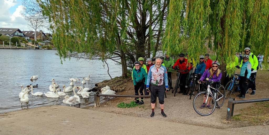 Sunday 12th April, with a blustery Headwind, 1 person lost somewhere in the town, 16 Cyclists left via Portsmouth Rd,- joined by 1 more, alas that person had a visit from the ‘P fairy’, decided to head for home-, Giggshill green, alas a small tumble for 1 of the group, seemed to be OK at first, but a little later, deciding the swelling needed attenttion, another abandon 😒-, Weston Green, Esher, Walton- joined by 1 more (17)-, Weybridge, Addlestone, Bretlands, Homewood Park- a brief but heavy Hailstorm, more or less over by the time everyone had donned Waterproofs-, Foxhills, Gracious Pond, Burrowhill, to West End, (also known as Donkey town?) for lunch at the Hare & Hounds, (Hall & Woodhouse),very speedy service thanks to our pre-orders 👍, Pennypot, Chobham, Foxhills- from the other direction-, Ottershaw, Addlestone, Weybridge, Cowey Sale (Photo), to Walton Bridge, – to find the planned Tea stop had a few power problems, but fortunately the nearby Boathouse Cafe was fine, Walton, Molesey, Thames Ditton, Portsmouth Rd, to finish back in Kingston. Total 42 Miles, thanks to Lindsay for back marking, thanks to Steve, Amy & others for marking corners. Map:- www.plotaroute.com/route/3038427