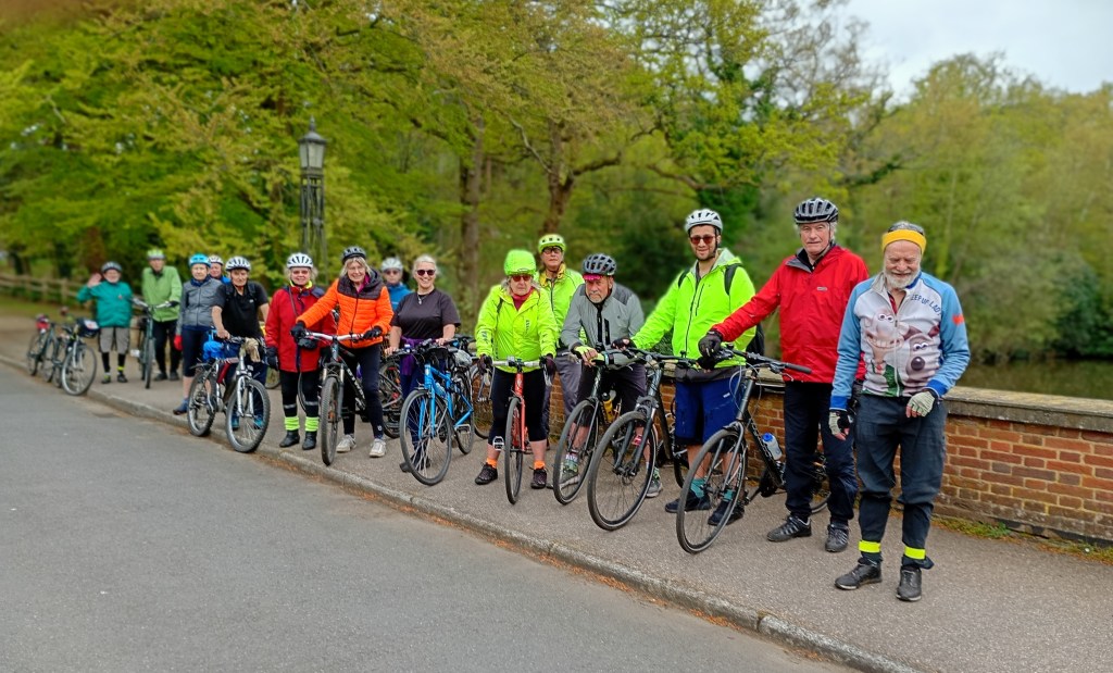 Wednesday 15th April, a mostly overcast day, with light drizzle for the Morning, occasional glimpses of Sun later, after 2 late cancellations, 15 Cyclists left via Portsmouth Rd, Surbiton, Long Ditton- joined by 1 more (16)-, Hinchley wood, Esher, Fairmile, Cobham, Hatchford, Ockham, the ‘new Wisley lane Cyclepath’, only to find a temporary detour for the Road has swallowed part of the path π, Wisley, to Pyrford Lock for lunch at the Anchor (Hall & Woodhouse), return to Wisley, Byfleet village, Brookllands Park, Weybridge, to the delightfully quaint, Whiteley village for refreshments at the new Community Cafe, also pausing near the Lake (Photo), Hersham, Walton, Esher, Weston Green, Giggshill Green, Portsmouth Rd to finish back in Kingston. Total 30 Miles, 1 new face, thanks to Steve D for back marking, thanks to Toni & others for corner marking. Map:- www.plotaroute.com/route/2006267.