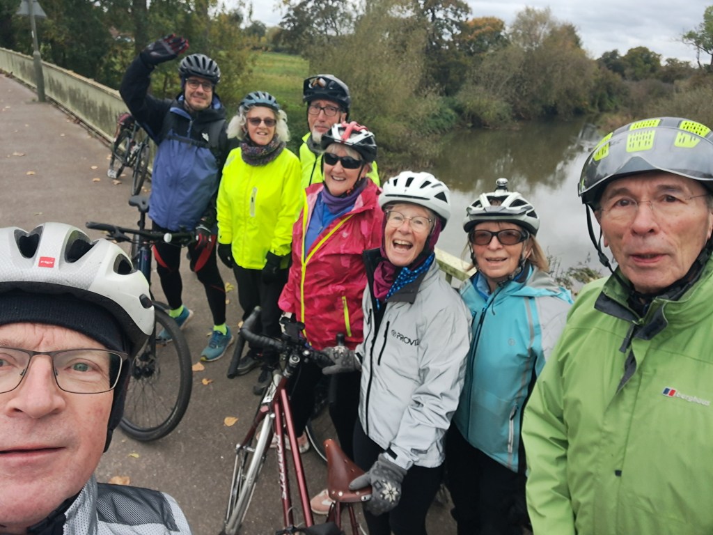 Sunday 10th November. A cloudy grey day, with light Mizzle (misty Drizzle), with 1 late cancellation, 1 forced to abandon the ride due to a defective brake, 1 extra guest, who had mistakenly booked on a different event, 20 Cyclists split into 2 groups, group 1 not quite ready, so group 2 led the way via Kingston Bridge, Bushy Park, Hampton, to Hanworth to pause at the War Memorial for the 2 minute silence, -but as they were in the midst of a longer service, sadly no chance for Andrea to read from Laurence Binyon’s ‘For the Fallen’-, Sunbury, Ashford, Staines, Staines Bridge, Egham, Stroude, to Thorpe Green (Photo group 1), for lunch at the Rose & Crown (Barons Pubs), – very speedy service, with great food & drink, (Photo group 2), alas 1 of group 1 had a visit from the ‘P fairy, despite a slightly confused assistant, who got the Tube’s mixed up, soon fixed-, continuing via Lyne, Bretlands, Addlestone, Weybridge, to Walton Bridge for refreshments at ‘Wilde Brunch’- joined by 1 more (21)-, Walton, Esher, Weston Green, Giggshill Green, Portsmouth Rd, to finish back in Kingston. Total 30 Miles, 1 new face, special thanks to Bai for leading group 2, thanks to Celia & Amy for back marking each group. Map:- www.plotaroute.com/route/2802886