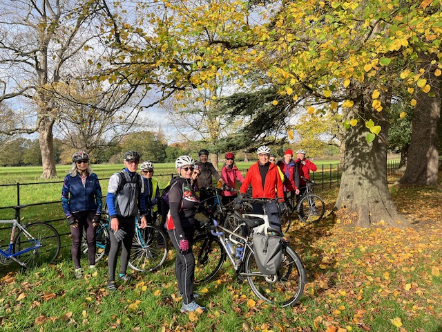 Sunday 13th October. A mostly cloudy day, after 1 cancellation, plus 1 person ssuffiring a visit from the ‘P fairy’, on his way to the start, hoping to catch the group up, 12 Cyclists left via Kingston Bridge, Bushy Park, Hampton, Hanworth, Sunbury, Ashford, Stanwell, Stanwell Moor, Poyle, Horton, Datchet, Jubilee River path, to Dorney for our prebooked lunch’s- still no sign of the ‘P’ victim, as we finished eating, then who’s that walking through the door, yes he found us, so a slight delay, whilst he consumed his Soup-, passing Dorney Lake, across Summerlease Bridge, Fifield, Cranbourn, Cranbourn gate Windsor Great Park, (Photo), the Village, Bishop’s Gate, Englefield Green, Egham, Staines Bridge, Staines- now realising, we wouldn’t reach the planned Tea stop in time, lets try Notcutts, Garden centre, no joy they had stopped serving, how about a detour to Longacres G C, alas, a visit from the P fairy, meant we would miss that one as well, so no Tea stop-, Laleham, Shepperton, Walton Bridge, Walton, Esher, Weston Green, Giggshill Green, Portsmouth Rd, to finish back in Kingston. Total 49 Miles, thanks to Chris F for back marking. 2 P fairy visits. Map:- www.plotaroute.com/route/141834