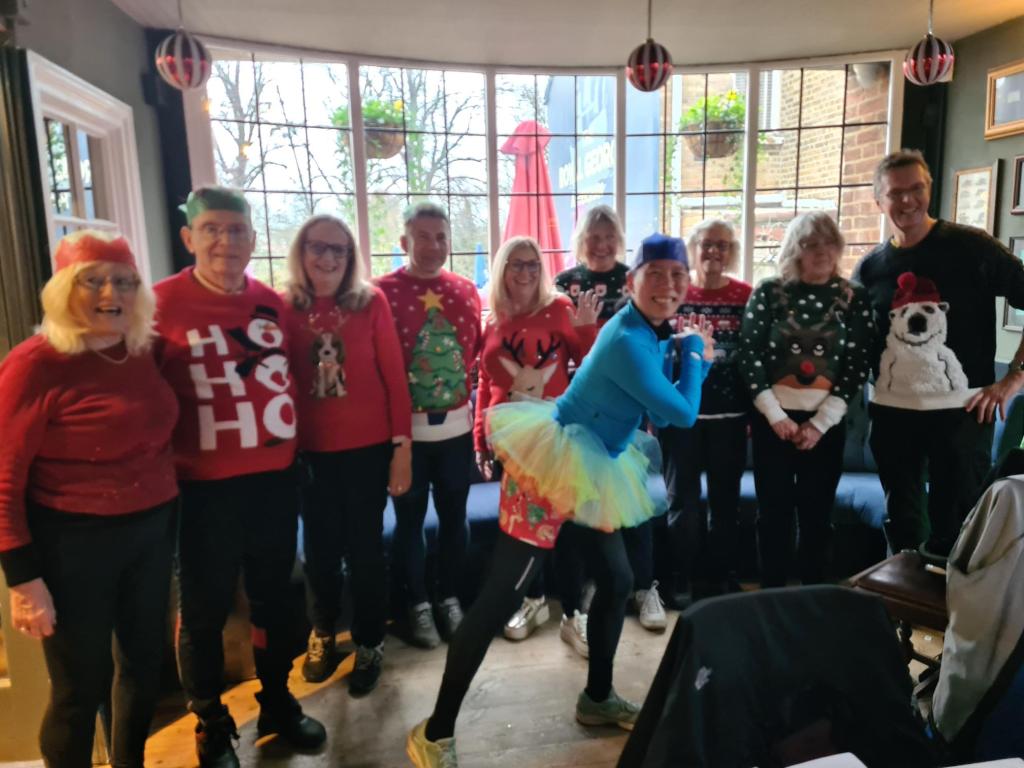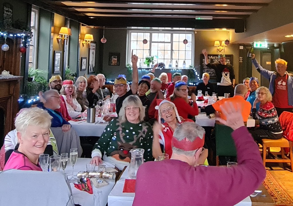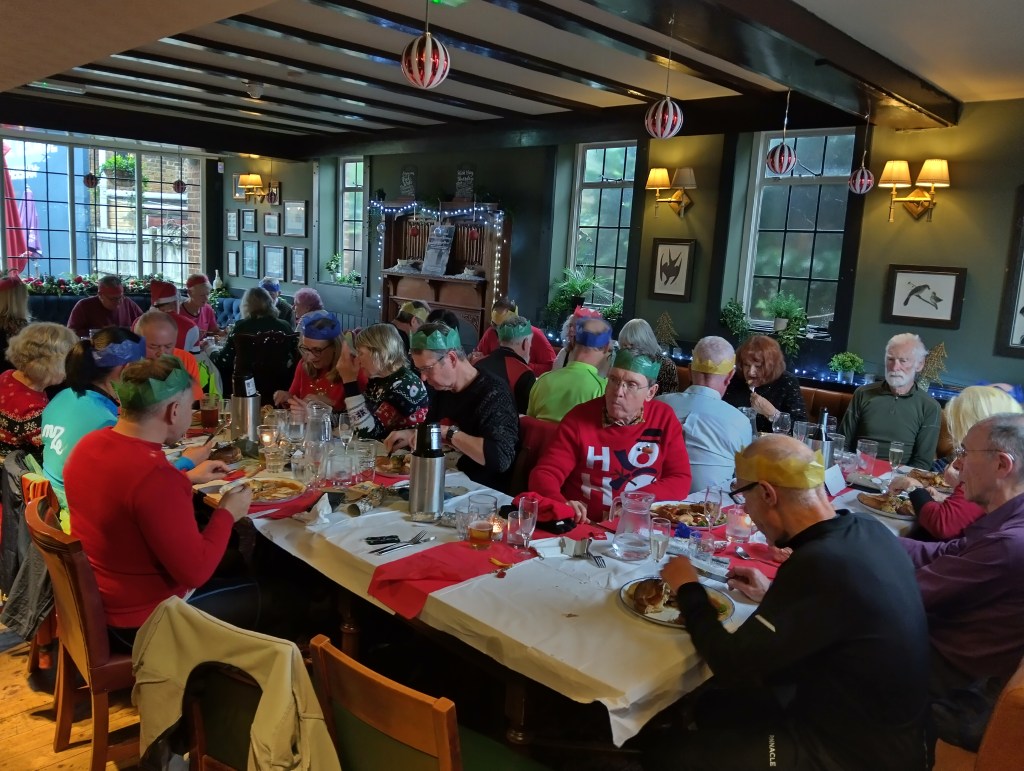 Sunday 8th December. With ‘storm Darragh’ still blowing through the area, it was wise to advise all to go straight to the lunch venue, but amazingly a total of 11 Cyclists, either didn’t read the message, or decided to ride regardless, after a brief discussion, a decision was made, so via Portsmouth Rd, to Surbiton for an impromptu Coffee stop at the Clocktower Cafe, then a tour of Berrylands & Tolworth, to Thames Diitton for a delicious lunch at the ‘Limping Fox’, joined by another 23 or was it 24 Cyclists (some with Bikes, some without), after thank-you speeches from Bai, & a response from myself, with 2 prizes this time, for Bai with all his co-leading & Celia for her cheerful back marking, sometimes with really nasty Weather, now with steady drizzle & time getting short, 3 more joined the return trip back to Kingston. Total 8.5 Miles Cycled, special thanks to Celia for back marking. Map:- www.plotaroute.com/route/2823884