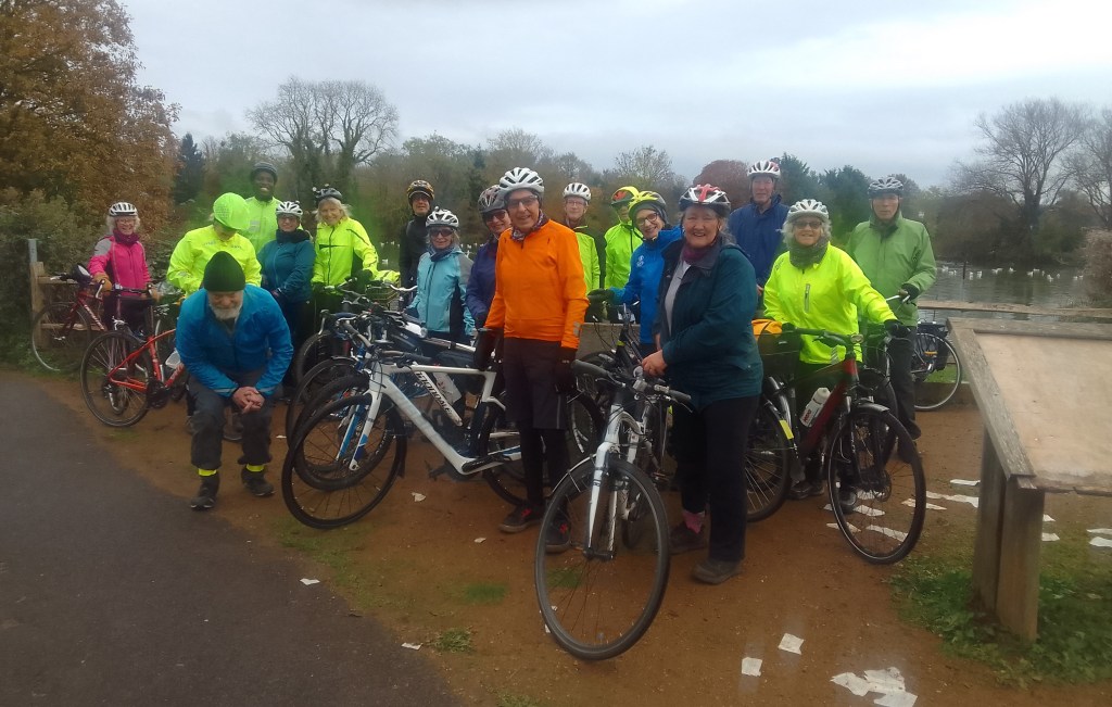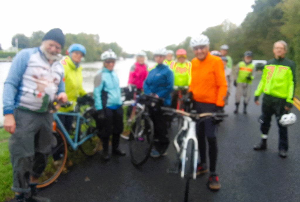 Wednesday 18th October, after 3 late cancellations & 2 missing a train, with very light Drizzle as we left, 11 Cyclists via Portsmouth Rd, Thames Ditton- with 1 more joining in-, Gigghill Green, Weston Green, Esher, Walton on Thames, Weybridge, Brooklands Park, Byfleet, New Haw, Rowtown, to Addlestone for lunch at the delightful Pelican, also finding the pair who missed the Train, now 14 in total, also the Drizzle becoming steady Rain, but no dropouts yetβ¦. Also making minor adjustments to a rubbing Mudguard, Woburn Hill, Chertsey Meads, Chertsey Bridge, Shepperton (Photo), Haliford, -a brief debate to stop for Tea or not, no stop this time with Rain gradually increasing-, Sunbury, Hampton, Bushy Park, Hampton Wick, Kingston Bridge to finish. Total 29 Miles, Special thanks to Celia for back marking, & others for corner marking. Map:- www.plotaroute.com/route/1868983