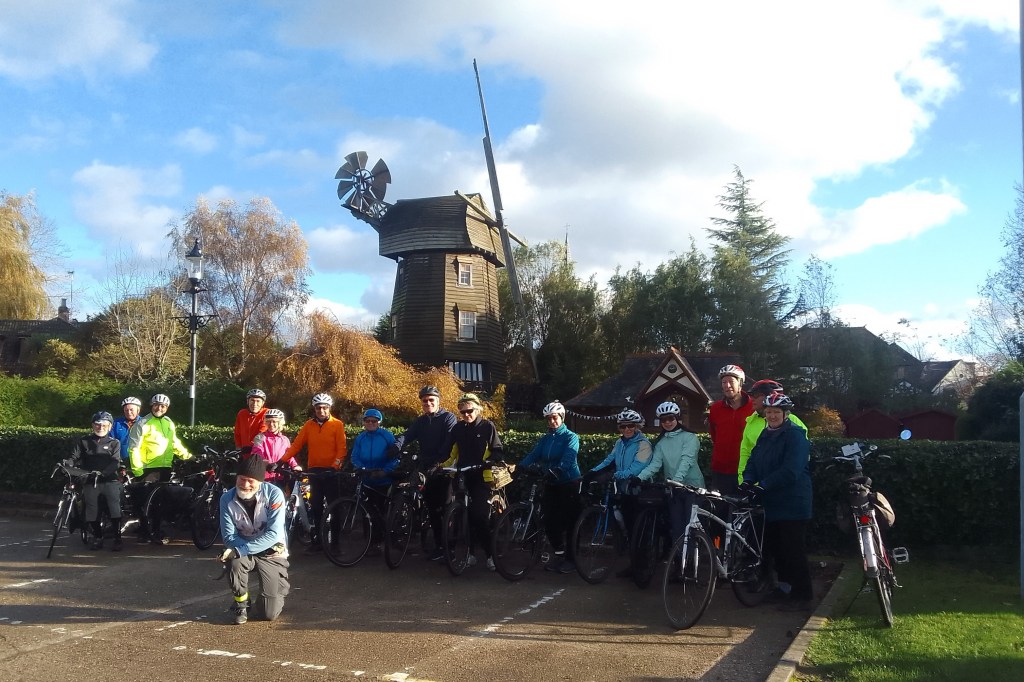 Wednesday 15th November. A bright Sunny slightly chilled day saw after 1 late cancellation & 1 extra unexpected guest, alas 1 person left the Market place in the wrong direction, maybe following a different group, so 16 Cyclists left via Kingston Bridge, Bushy Park, Hampton, Hanworth, Sunbury, Ashford, Staines, Hythe End, to Wraysbury for lunch at the George Inn (Gastro Pub), we were all glad to see the missing Cyclist managed to find his own way to the Pub, despite suffering a nose bleed on the way, with a Photo stop at the Windmill & 2 nice Motorists moved out of the view π, then Poyle,- now with a nice tailwind-, Stanwell Moor, Stanwell, Bedfont, Feltham, Hanworth Park, Leitrim Park, River Crane path, to Kneller Gdns for Tea & refreshments, Twickenham, Strawberry hill, Teddington, Hampton Wick, Kingston Bridge to finish. Total 30 Miles, thanks to Chris F & Celia (again), for back marking. Map:- http://www.plotaroute.com/route/1656189