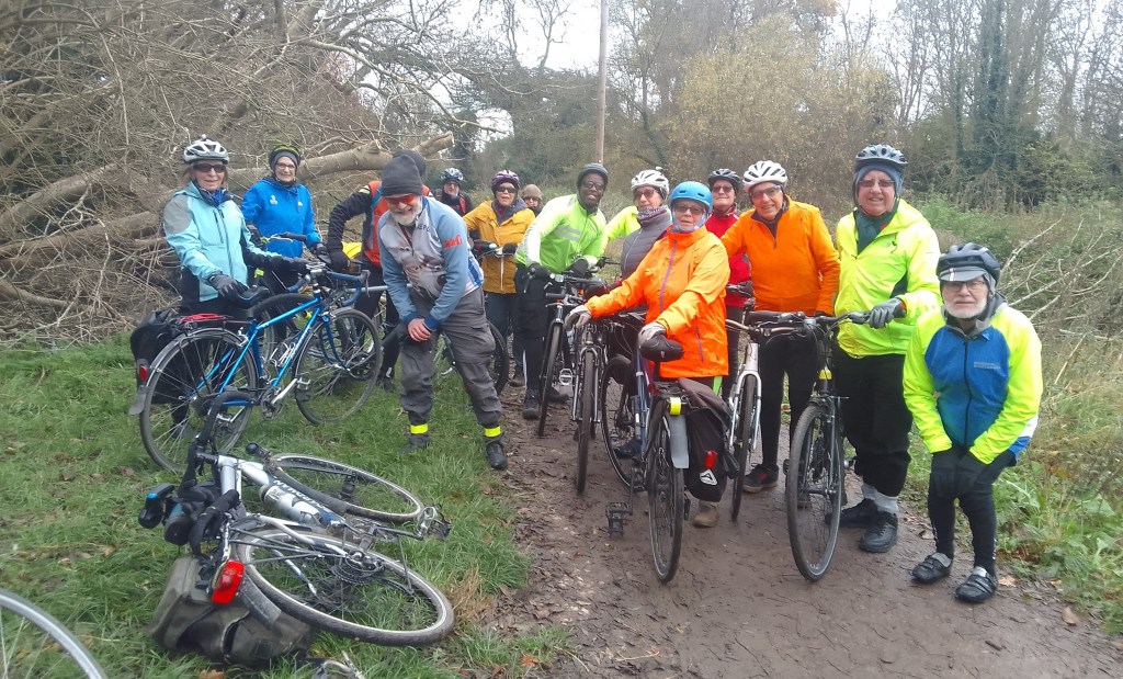 Sunday 12th November, with light Drizzle to start, & slightly heavier Drizzle after Tea, after 4 late cancellations & 1 no show, 17 Cyclists were asked to walk away from the Market place, to Portsmouth Rd, Long Ditton- joined by 1 more recruit, Hinchley wood, to pause for the 2 minute silence at 11am, followed by a reading of βFor the Fallenβ,by Laurence Binyon, βThey shall not grow old as we that are left grow old from Andrea, then Esher- with a slipped Chain swiftly sorted-, Fairmile, Cobham, Downside, Bookham Common, to Little Bookham for lunch at Ye olde Windsor Castle (Chef & Brewer), only had capacity for the 8 booked in advance, despite the website suggesting other meals could be taken in the Bar area π, more Bookham, Fetcham, (Photo), Leatherhead, Ashtead, Ashtead Common, Epsom Common to Epsom for Tea & Bread pudding at Old Moat Garden centre Cafe, West Ewell, Tolworth, Surbiton to finish back in Kingston. Total 28 Miles, thanks to Celia for back marking, thanks to Toni & Bai for marking corners, thanks to John D for the BP. Map:- www.plotaroute.com/route/1814953