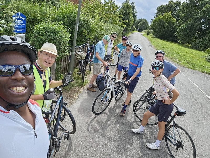 Sunday 6th August. A rather windy but Sunny day saw 12 Cyclists leave from Tolworth Station, via Chessington, Claygate, Princes Coverts, – somewhat of a Mudbath after recent heavy rain, (don’t blame the ride leader, an act from the Weather gods, or the other bloke, absent without leave)-, Stoke D’ Abernon, Fetcham (Photo), Bookham, Effingham, Whitedown, Abinger, Holmbury St Mary, Forest Green, to Walliswood for lunch at the delightful ‘Scarlett Arms’, -a slight delay as the ‘P Fairy had paid a visit -, Okewood hill, Weare St, Ockley, Capel, Newdigate, Shellwood Cross to Brockham Church, – doubley handy, as there was no Bread pudding provider for this ride, but the Church had many delicious Cake’s to fill in-, Pixham, Mickleham, Norbury Park, Leatherhead, Ashtead Common, Epsom, West Ewell, to finish a bit later than expected back in Tolworth. Total 50 Miles, Very special thanks to Bai for leading, thanks to John E for back marking, thanks to Chris F & Celia for marking corners.