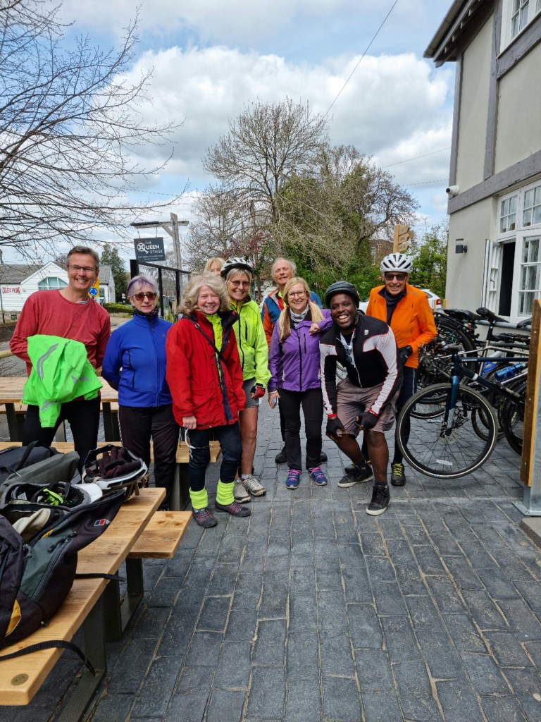 Sunday 10th April, a mostly bright sunny day, after 2 cancellations, and 2 no shows, 19 Cyclists split into 2 groups, left via Portsmouth Rd, Long Ditton, Hinchley Wood, Littleworth, Claremont, – with 1 local resident a little upset that group 2 knew the way out-, Fairmile, Cobham, Hatchford, Martyr’s green, to Effingham for lunch at a very hospitable, ‘Queen Stage’ (a term used in multi-day Cycle races for the hardest stage), (Photo group 2), with 1 defection from group 1 to group 2, Bookham, Fetcham, Leatherhead, Ashtead, Ashtead Common, Epsom Common (group 1 photo), to Epsom for Tea & Bread pudding at ‘the old Moat Cafe’, with a defection from group 2 to group 1, also ‘Sat-nav’ for group 2 deciding to retire early, but ‘the Stowaway’ from lunch saved the day, West Ewell, Tolworth, Berrylands, to finish back in Kingston. Total 30 Miles, Special thanks to Bai for leading group 2, thanks to Chris F & Mike F for back marking each group, thanks to John D for the BP.