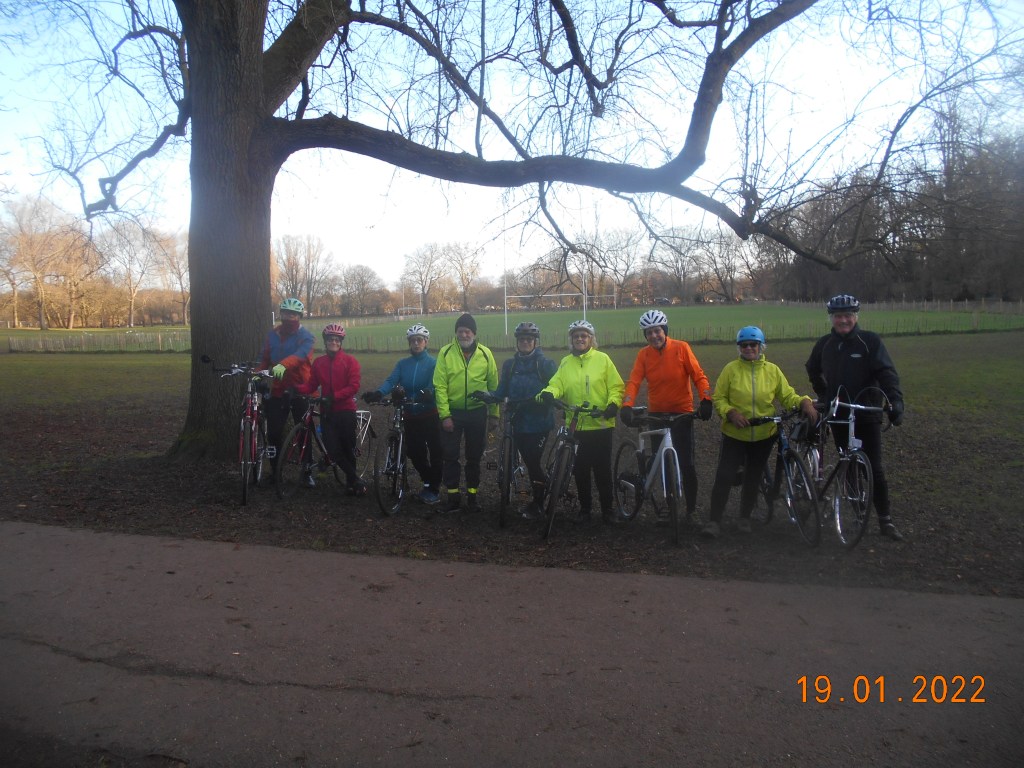 Sunday 28th November. a not quite frozen, sunny day, after 6 late cancellations, saw 16 Cyclists in 2 groups, leave via Berrylands, New Malden, Motspur park, -collecting 1 more for group 2-, Cannon Hill, Morden, Morden Hall Park, Mitcham, -collecting 1 more for group 1-, Tooting, Tooting Bec Common, to Streatham Hill for lunch at the very reasonable ‘Crown & Sceptre’, Tulse Hill, Brockwell Park, Brixton, Clapham Common, Wandsworth Common (Photo group 1), a novel detour to Wandsworth, King Georges Park, Earlsfield, to Wimbledon Park for Tea & Bread pudding, Wimbledon village, Raynes park, New Maldeen, Norbiton, to finish back in Kingsto. Total 27 Miles, Special thanks to Carl for leading group 2, thanks to Chris F for taking on the Back marking at short notice, also thanks to Mike for back marking group 2, thanks to John D for the BP.