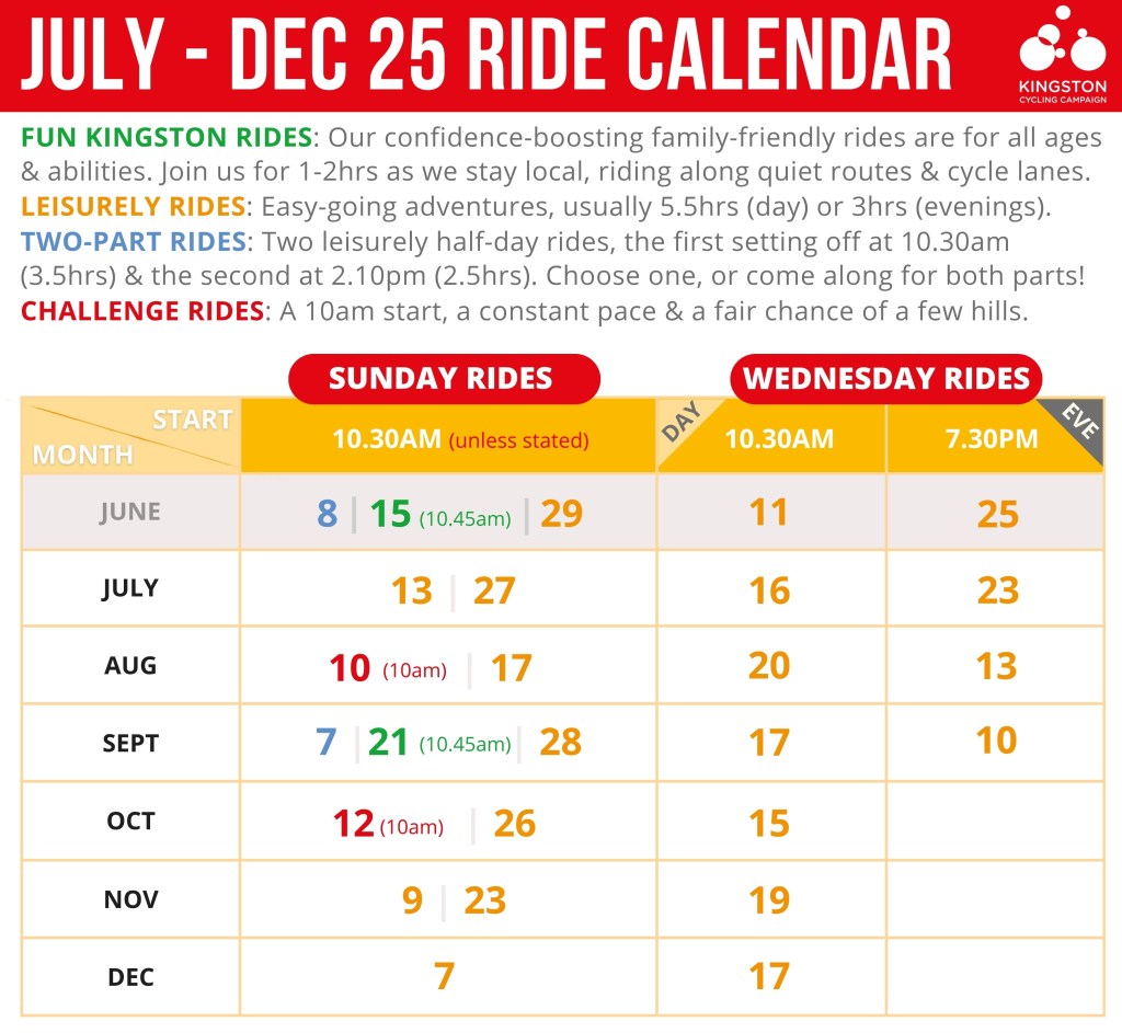 Our free rides are bookable via lcc.org.uk/organizer/kingston-cycling-campaign once the routes are confirmed (usually two weeks beforehand) and start in Kingston’s Ancient Marketplace (beneath the Queen Anne statue – Market House) unless stated otherwise.