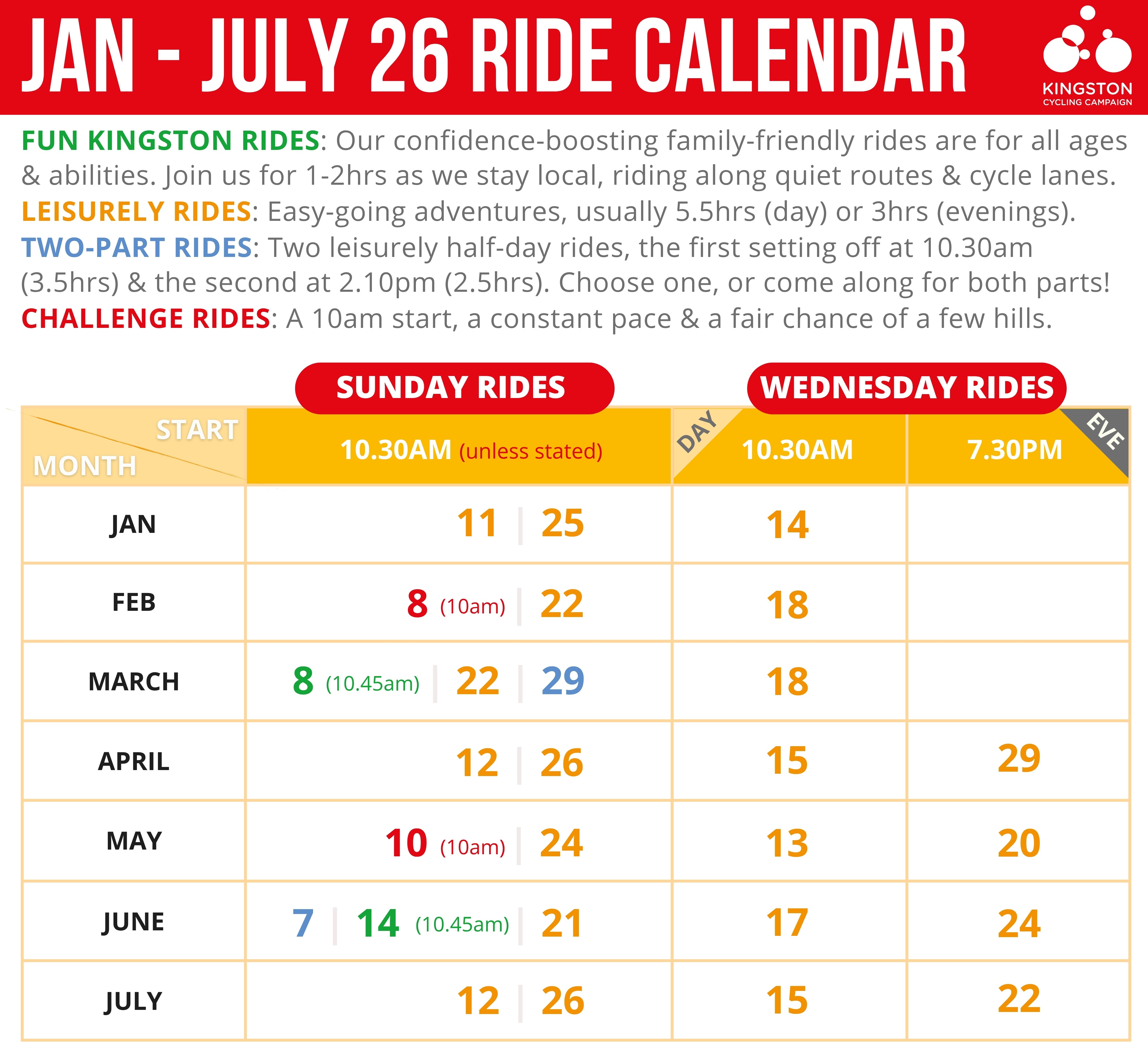 Our free rides are bookable via lcc.org.uk/organizer/kingston-cycling-campaign once the routes are confirmed (usually two weeks beforehand) and start in Kingston’s Ancient Marketplace (beneath the Queen Anne statue – Market House) unless stated otherwise.
