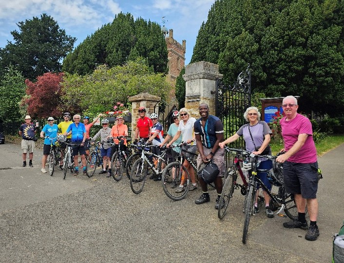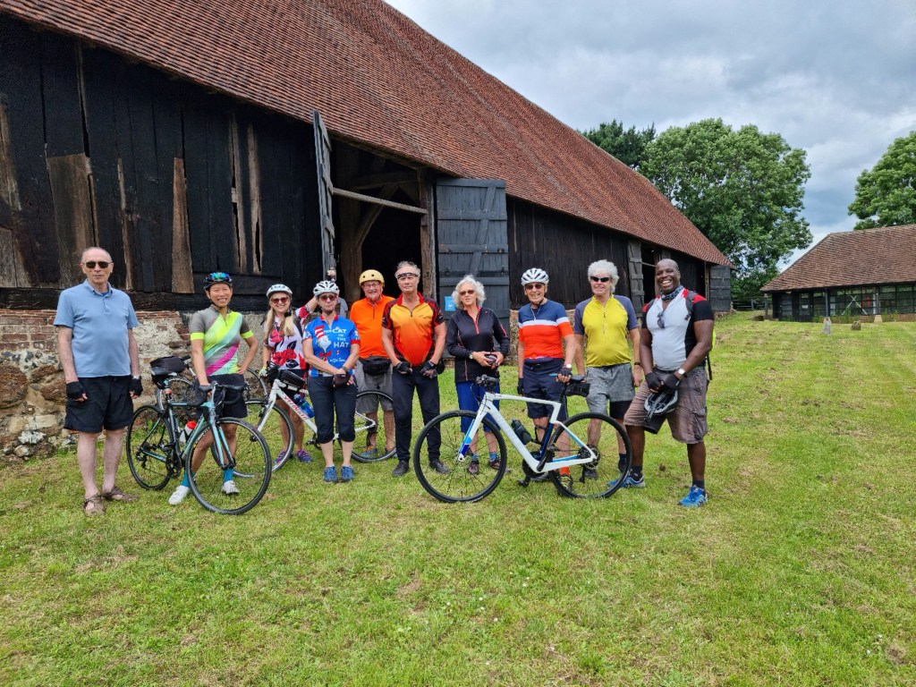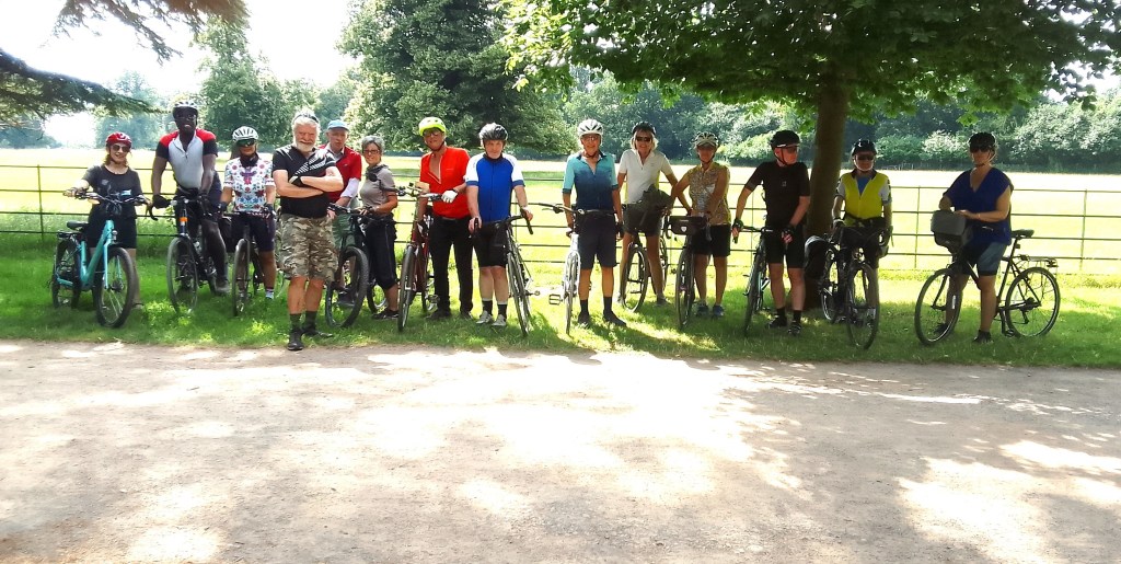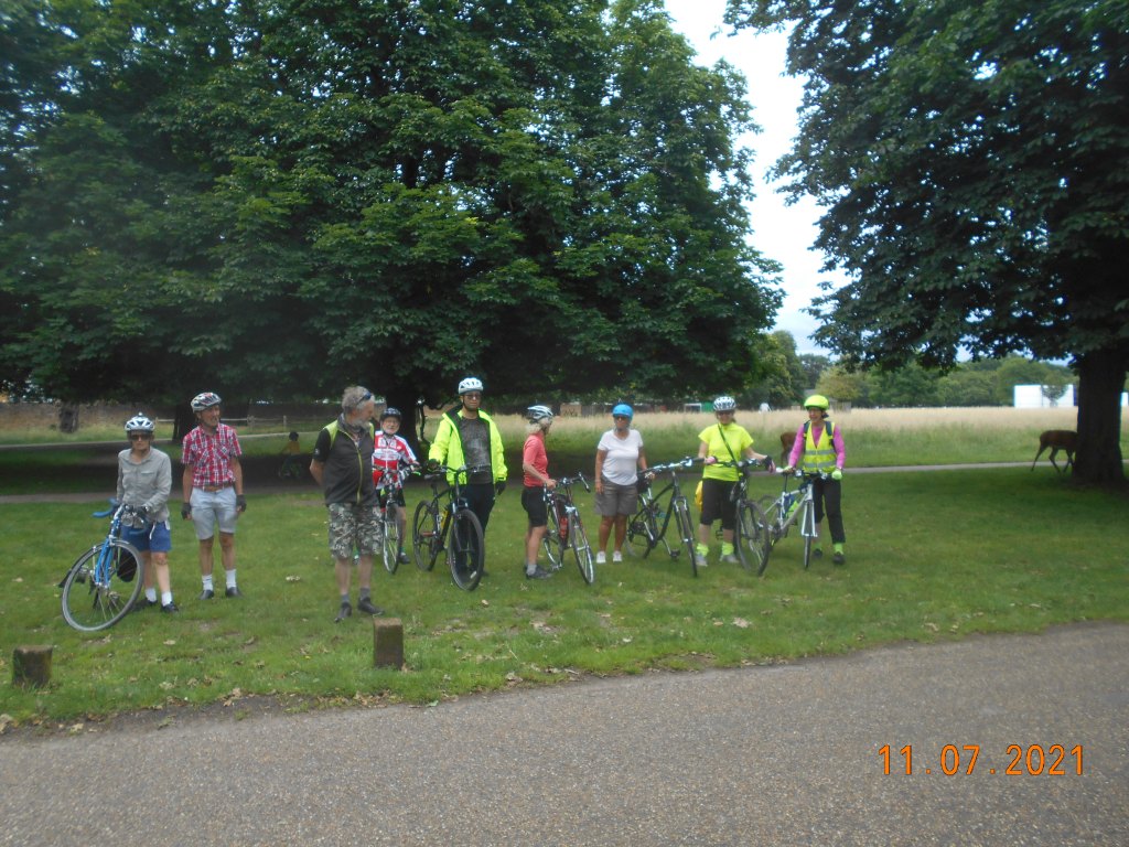 Sunday 27th July. A mostly overcast but dry day, a subdued mood & a Minutes silence following the sudden death of our good friend Bai, with 1 no show, 16 Cyclists left via Kingston Bridge, Bushy Park, Hampton, Hanworth, Sunbury, Ashford, Stanwell, Stanwell moor, Poyle, Harmondsworth Moor- with a pile of Garden rubbish seemingly deliberately blocking the exit from the pathπ-, to Harmondsworth for lunch at the Crown (very good value grub π), after a quick visit to the Great Barn, Sipson, Harlington- including a special Water feature in the Subway under the M4, was it a message from our friend now in heaven, to remind us all of a similar incident when he found himself in much deeper water a few years ago?-, Hayes, Grand union Canal towpath, Southall, Norwood Green, – sadly the P fairy had payed a visit to 1, but as we were so close to our Tea stop in Osterley Park, others continued, whilst the repair was swiftly performed-, after pausing at the House for a Photo, Osterley, Hounslow, Whitton, Twickenham, Strawberry hill, Teddington, Hampton Wick, Kingstoon Bridge, to finish back in Kingston. Total 30 Miles, 1 almost new visitor (6 years or so since last visit), thanks to Chris F for back marking. Map:- www.plotaroute.com/route/840250