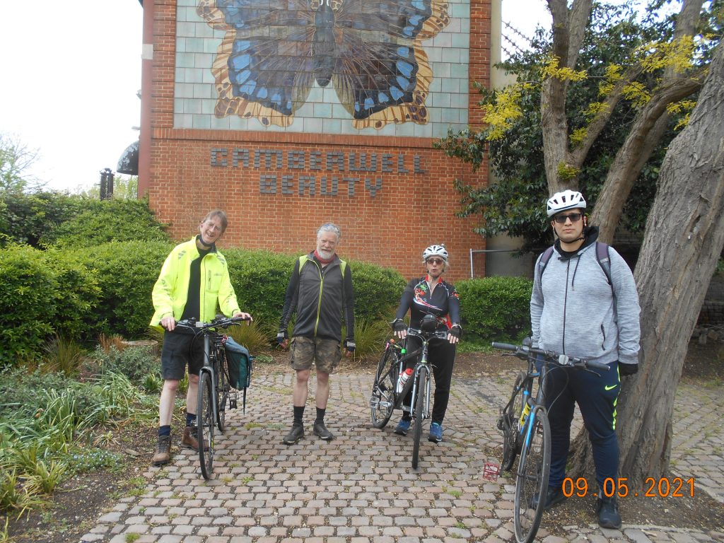 Sunday 9th May, a very pleasant sunny day, much warmer than of late, saw 23 Cyclists, with 1 cancellation, split into 4 groups, but all groups seemed to play a version of Musical chairs at various stages of the day, (group 2 not being quite ready, so they were demoted to group 4). Leaving the Market place via Fairfield, Norbiton, New Malden, Raynes park, South Wimbledon, Wandle path, Earlsfield, with Group 3 suffering a visit from the ‘P Fairy’ meaning Group 4, now became group 2 ?, Wandsworth Common, Clapham Common, Vauxhall, Camberwell to Burgess Park for a Picnic lunch, pausing earlier at the Lime Kiln, the Camberwell Beauty Mosaic & also ‘Silent Raid’, an Art installation in memory of a Zeppelin raid from WW1,