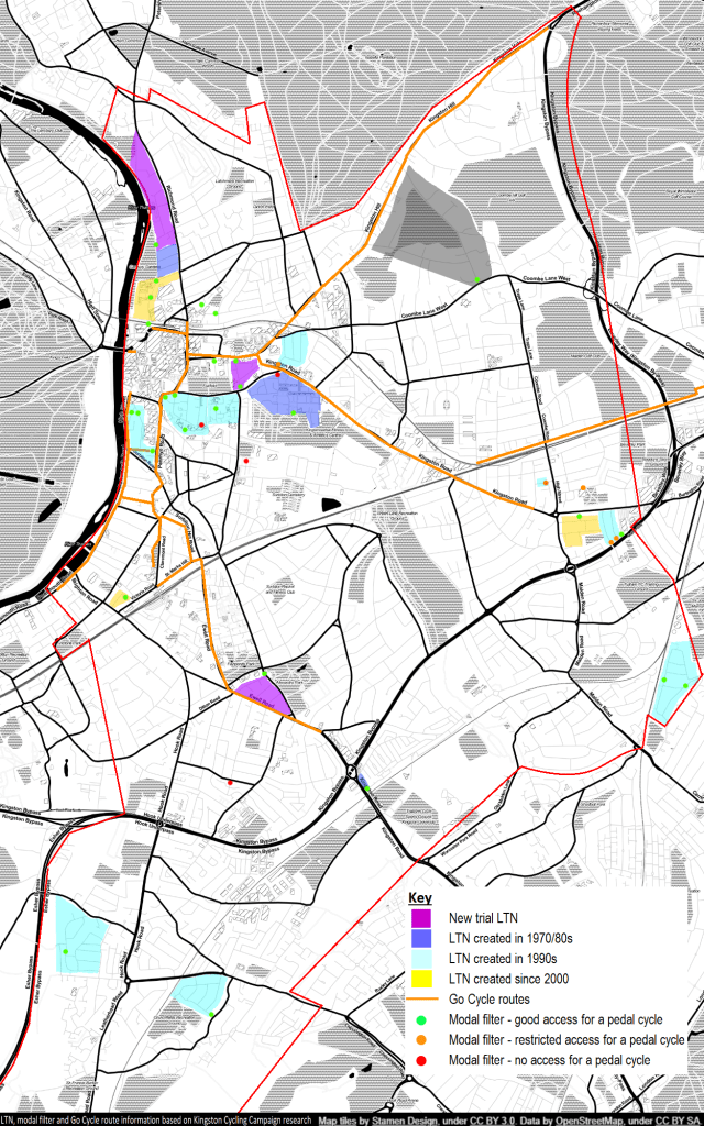 As a decision by the Council on Kingston’s three Low Traffic Neighbourhood (LTN) trials approaches, Kingston Cycling Campaign has been undertaking research into the history of LTNs in Kingston.